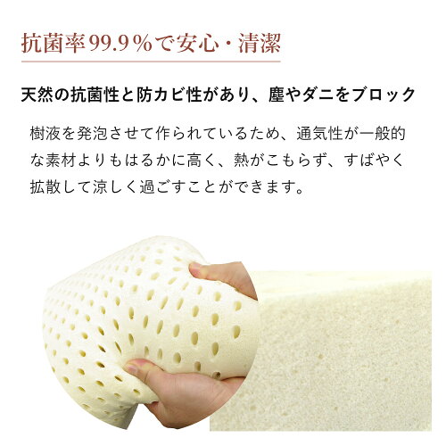 抗菌率99.9%で安心・清潔 樹液を発泡させて作られた高品質のラテックスで作られているため、 天然の抗菌性があり、カビや菌、ダニを寄せつけません。